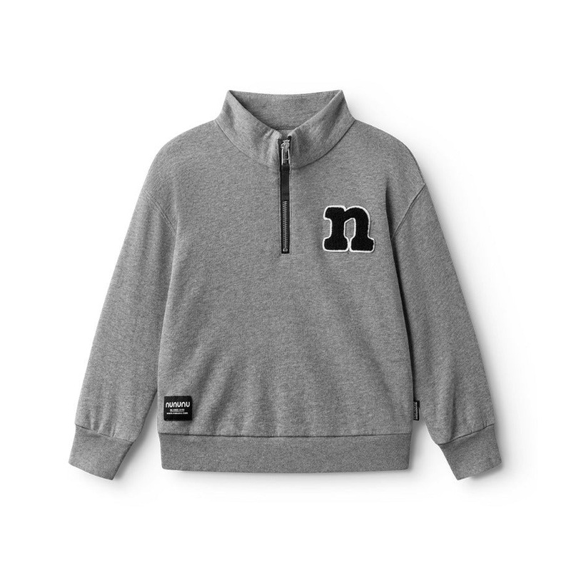 we ride or die collegiate vibes. thats why this gender neutral fit has a rare understated look, perfect for when your child is acting extra wild. its made of super soft heather grey french terry with a partial zip that comes up to meet a rounded high colla