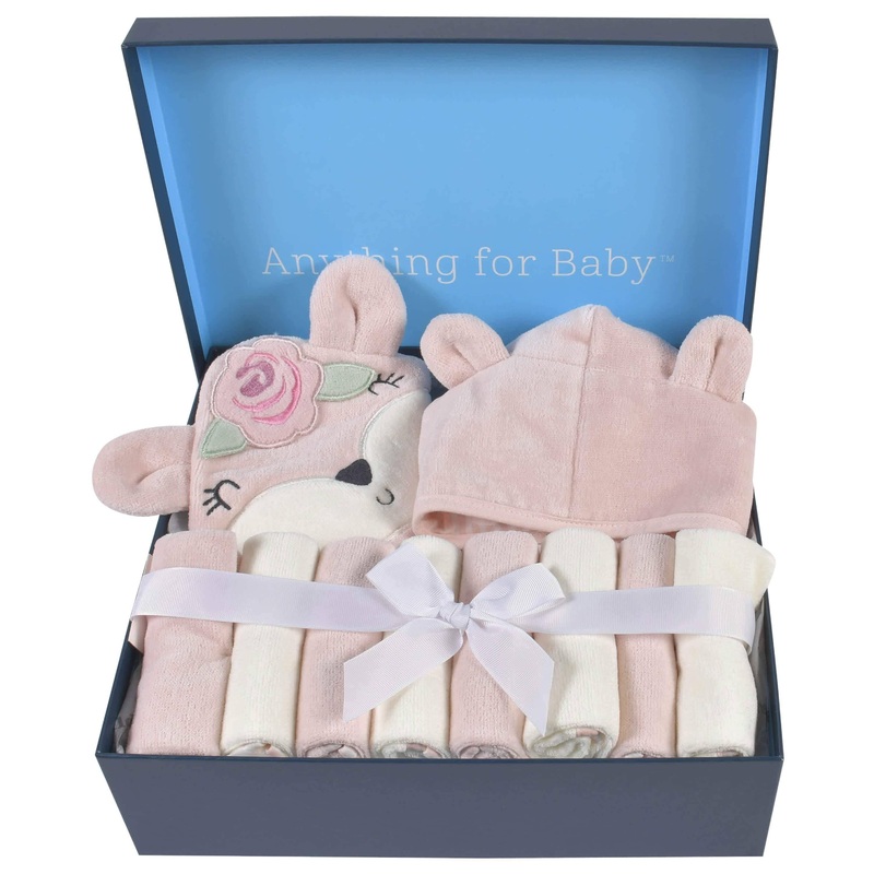 When its time to give your little one a bath, why not pamper them as much as you can? Our 10-piece fox themed baby girl bath set includes one snuggly hooded towel, eight soft washcloths, and one luxurious robe. Each piece is made with cotton woven velour terry, a super soft and absorbent fabric thats perfect for gentle cleansing and drying. We had our essentials independently certified with STANDARD 100 by OEKO-TEX so that you dont have to worry about harmful substances in your babys wardrobe. Our baby towel is sized at 26″ x 30″, and our baby washcloths are sized at 9″ x 9″, the perfect size for young babies. The towel features a super snuggly hood to keep your little one warm while you dry them off before you Dress them for complete comfort in our adorable baby robe, sized 0-9M. This set is perfect to give as a baby shower gift and comes packaged in a precious gift box. Each piece is machine washable.