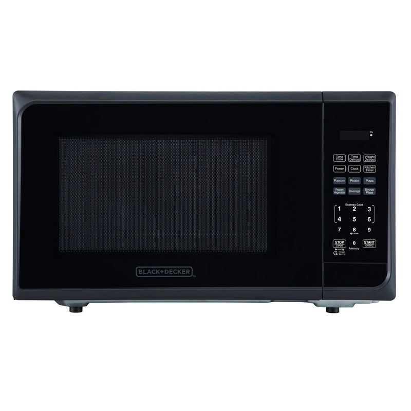 Black + Decker 1.1 Cu. Ft. 1000 Watt Microwave Oven – Stainless Steel EM031M2CE. This BLACK + DECKER 1.1 cubic foot Stainless Steel Microwave Oven is the perfect solution for smaller kitchens with limited counter space. Heat food quickly with One Touch settings, 1000 watts of cooking power and 11 power levels in this 1.1 cubic ft. microwave. It features electronic controls and LED display which are easy to see and use. This 1000 Watt microwave oven has 6 quick set menu buttons without having to select the cook time or power level and 30 second express cooking. It also contains a setting for weight and time defrost.