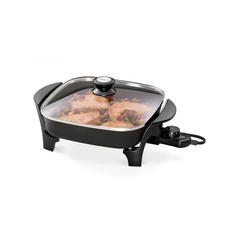 Roast, fry, grill, stew, bake, make casseroles and more in this attractive 11-inch electric skillet. High sidewalls and a luxurious tempered glass cover with stay-cool handle make it ideal for breakfast, lunch, dinner, and entertaining. It easily doubles as a handy buffet server. Nonstick surface, inside and out, provides stick-free cooking and easy cleaning. Control Master heat control automatically maintains the desired cooking temperature. Saves energy tooits more efficient to use than a range burner or oven! The heavy cast aluminum base is virtually warp-proof. Fully immersible and dishwasher safe with the heat control remove