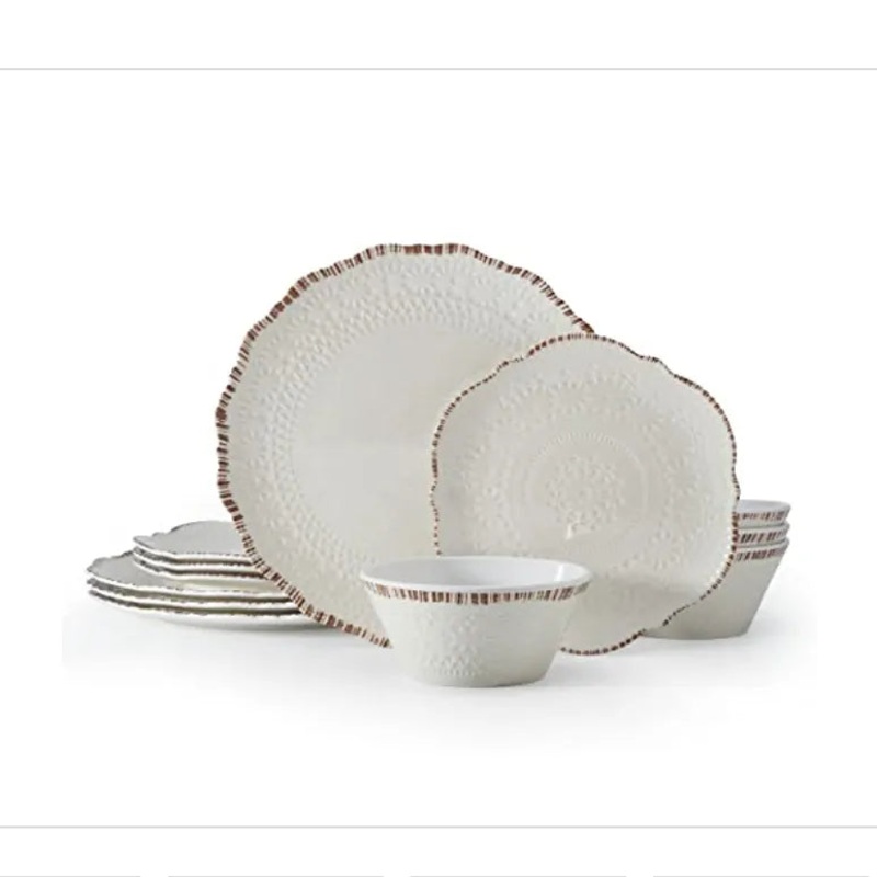 Description: This Chateau Cream Melamine Dinnerware Set features scalloped edges with a subtle antiqued accent color, a debossed, delicate lace-inspired design on the surface, and you won’t have to worry about it breaking, melamine is hardworking, durable and virtually indestructible, making it a natural for entertaining, especially outdoors. Dinnerware Set for 4: This 12 piece dinnerware set includes (4) each of: 11-1/4 inch dinner plate, 8-3/4 inch salad plate, and 6 inch diameter (23 ounce) soup cereal bowl Crafted of Melamine BPA-free Dishwasher safe Not suitable for microwave use.