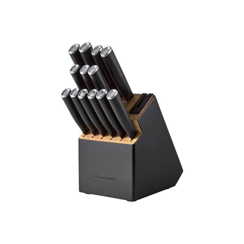 This KitchenAid Classic 14-piece knife block set is your go-to for everyday food prep tasks like slicing, cutting, chopping, mincing, and more. Crafted with precision, the knives feature blades made from semi-polished, high-carbon Japanese steel, ensuring lasting sharpness and professional-quality cuts. The ergonomic handles provide a secure grip for ultimate control, accented with stylish chrome endcaps. The set includes an 8-inch chef knife, 8-inch slicer knife, 5.5-inch serrated utility knife, 5-inch santoku knife, 4.5-inch fine-edge utility knife, 3.5-inch parer knife, 3.5-inch serrated parer knife, six 4.5-inch steak knives, and a two-tone storage block with a built-in sharpener to keep your blades at their best. The contemporary two-tone wood storage block adds style to your kitchen and features a built-in sharpener for easy maintenance. These KitchenAid knives are dishwasher safe on the top rack for convenient cleanup. To extend the life of your knives, hand washing is recommended. Dry immediately.