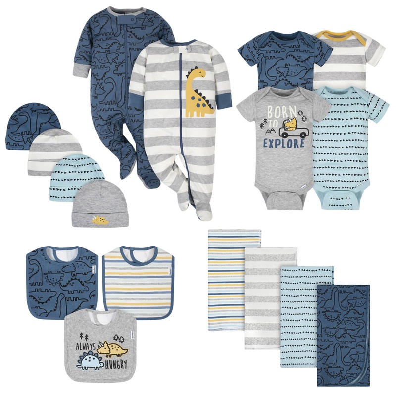 Fill up babys dresser in one purchase! Our dino themed 17-piece set is perfect to set baby up for success. It includes four short sleeve Onesies Bodysuits, two Sleep 'n Plays, four caps, three bibs, and four flannel receiving blankets. We had these product