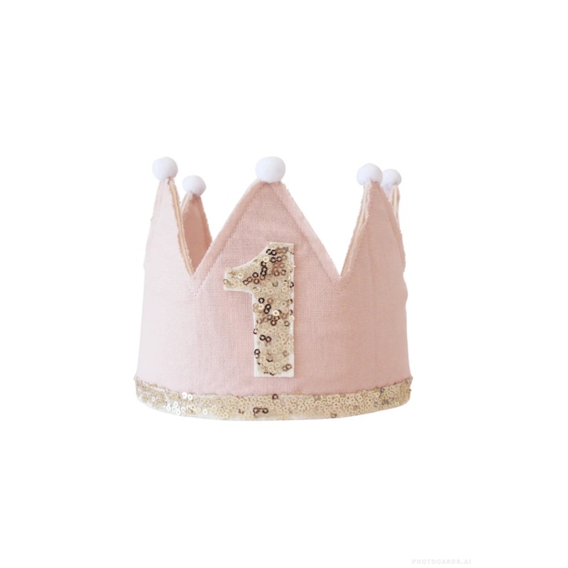 A 1st birthday pink linen and gold adjustable crown for your precious little one to celebrate. Bright sequins and felt with linen backing. Ribbon ties.