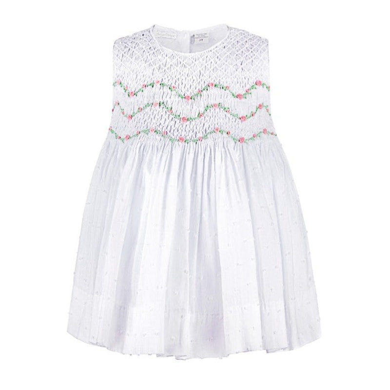 Looking for the perfect dress for your little one? Look no further than our Carriage Boutique Hand Smocked White Girl Dress. This beautiful dress is made of 100% cotton and features hand smocked flowers on a white background. This dress is buttoned back cl