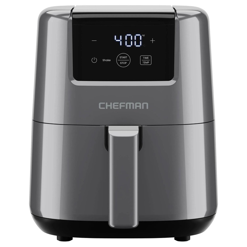 Healthy, fast cooking is within reach with the Chefman TurboFry Touch 2-Qt Air Fryer. Air fry quickly using little-to-no oil and cook up to three times faster than an oven. Revitalize any limp leftovers, create perfectly crisp French fries, and cook crunchy chicken tenders with a fraction of the calories. The touchscreen user interface lets you easily select cooking time and temperature, and the 2-quart capacity is perfect for cooking meals for 1-2 people. Shake notifications remind you to flip or stir your food for evenly cooked results. The nonstick basket and rack are both top-rack dishwasher safe to make cleanup easy, and the compact frame easily fits in kitchen cabinets and drawers. For added safety, the TurboFry air fryer shuts off automatically when the basket is removed, or the timer runs out. Purchase includes a 1-year assurance from Chefman. 900W/120V RJ38-2T-GREY New