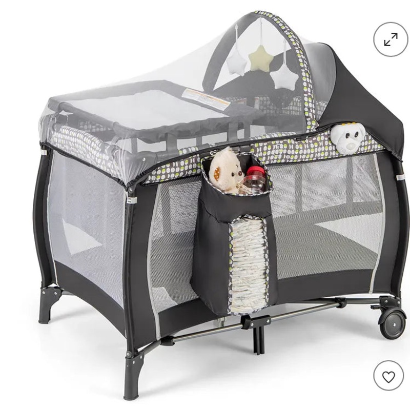 This versatile playbed can be used as a crib, bassinet, diaper table and activity center. With 2 lockable wheels, it is easier to move between rooms. For easy storage and transportation, this travel-friendly baby cradle can be folded into a compact size and stored in the included tote bag. Diaper table and netting awning can be removed as needed. The package includes a soft mattress, hanging toys and a music box.