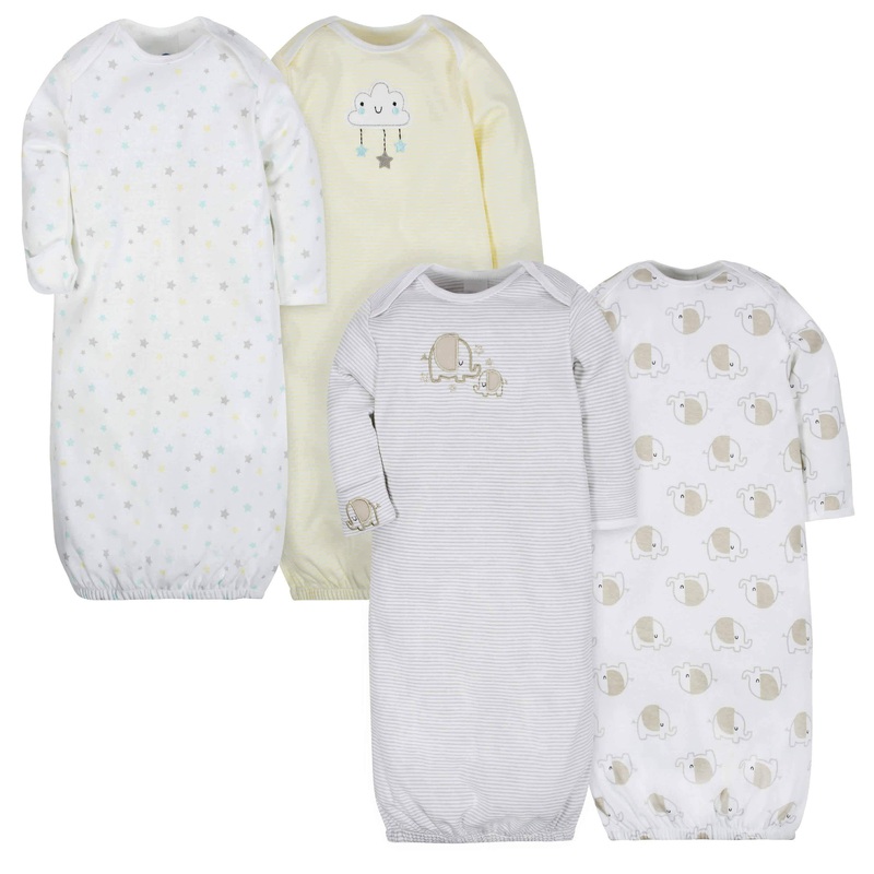 4-Pack Clouds & Elephants Baby Neutral Gowns