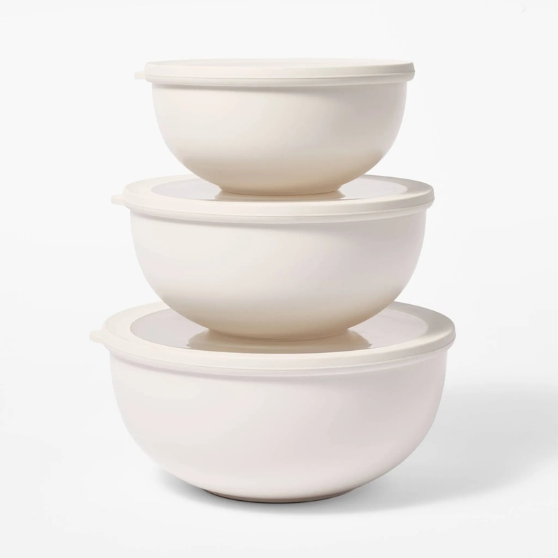The Plastic Mixing Bowl Set with Lids from Figmint comes in handy for a range of cooking and kitchen needs, whether you’re prepping ingredients or storing leftovers. This set of mixing bowls comes with three plastic bowls made of recycled plastic, along with three matching lids for a sleek look that’ll blend in nicely with your kitchen decor. The plastic mixing bowls feature a nesting design for easy storage, and they have nonslip silicone bases that help them stay put whether you’re mixing up ingredients or you place them on a dining table for guests to serve up a dish. Their break-resistant construction helps them last longer, complete with a dishwasher-safe design that allows for easy cleaning.