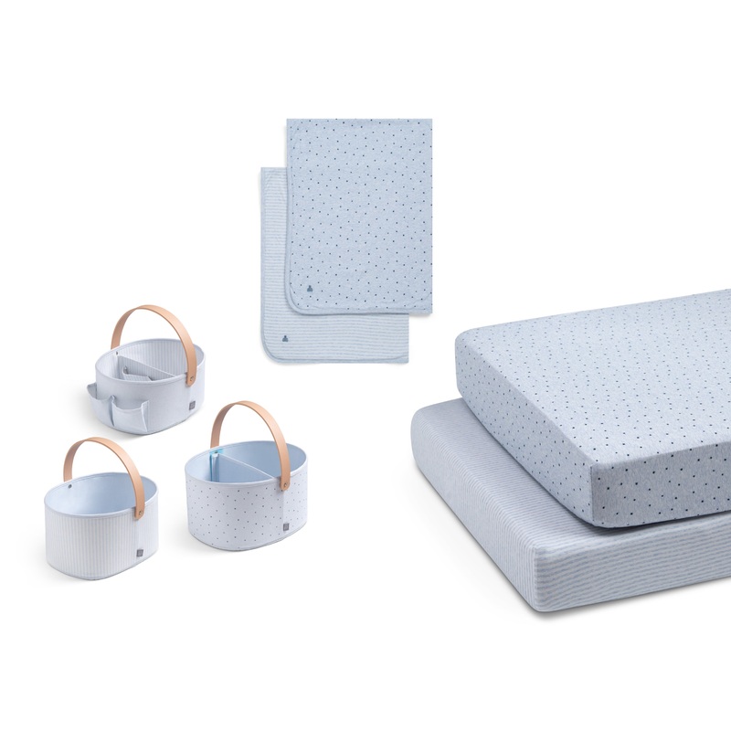 This babyGap by Delta Children 7-Piece Nursery Bundle includes everything you need; 2 Fitted Crib Sheets, 2 Blankets and 4 Fabric Bins.