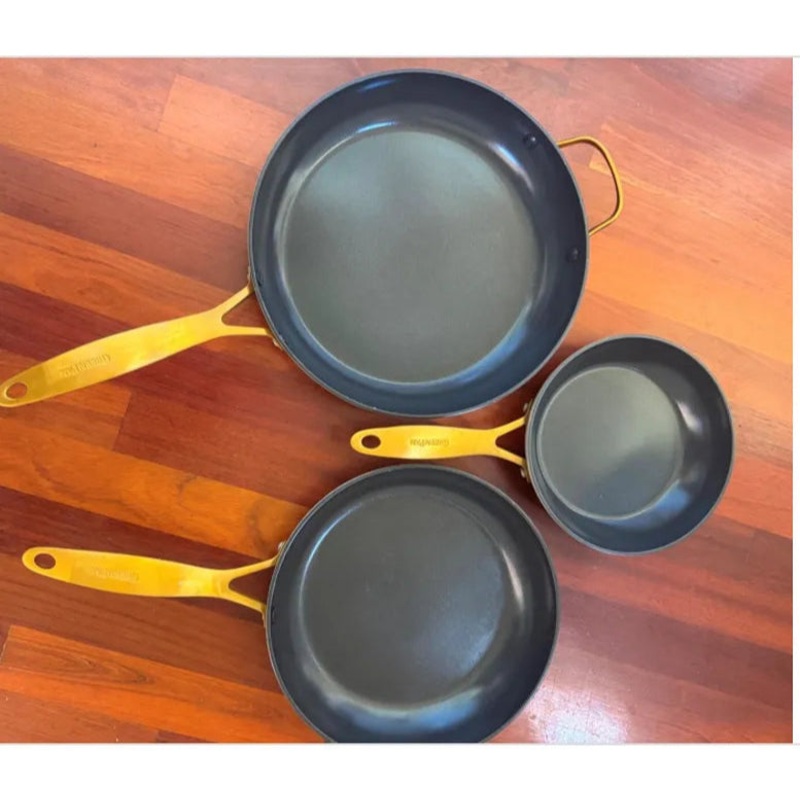GreenPan Jewel Pro Ceramic Non-Stick 3-piece Fry Pan Skillet Set - Size 8", 10", 12". Introducing the GreenPan Jewel Pro Ceramic Non-Stick 3-piece Fry Pan Set, a must-have addition to your kitchen! Made of high-quality anodized aluminum and ceramic, these