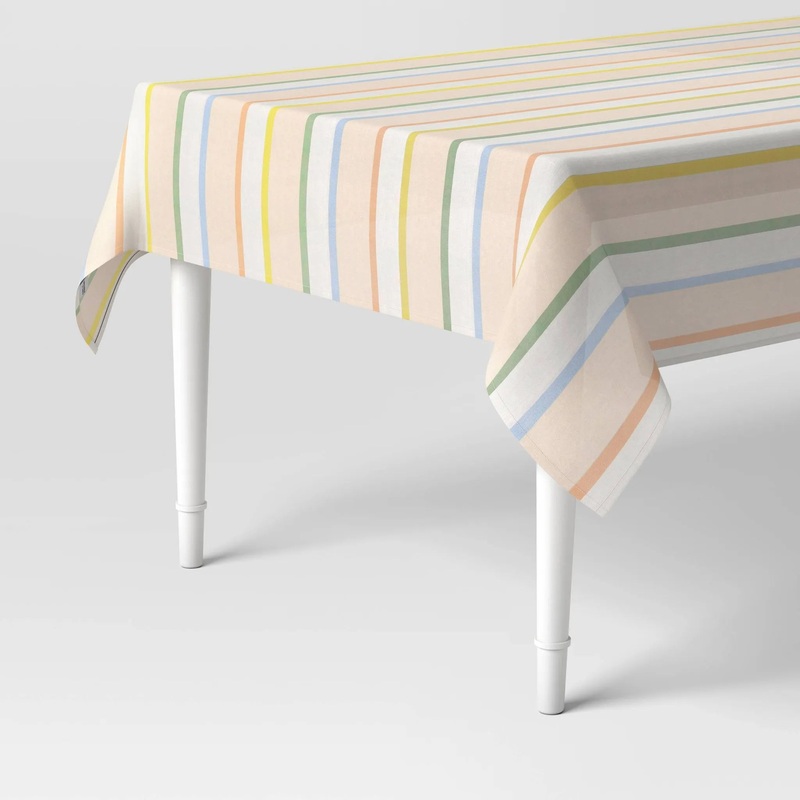 Bring cool style to your tablescape for any occasion with this Striped Tablecloth from Room Essentials. Made from cotton fabric, this rectangular tablecloth helps keep your dining table protected from spills, messes and scratches. Machine-washable for easy