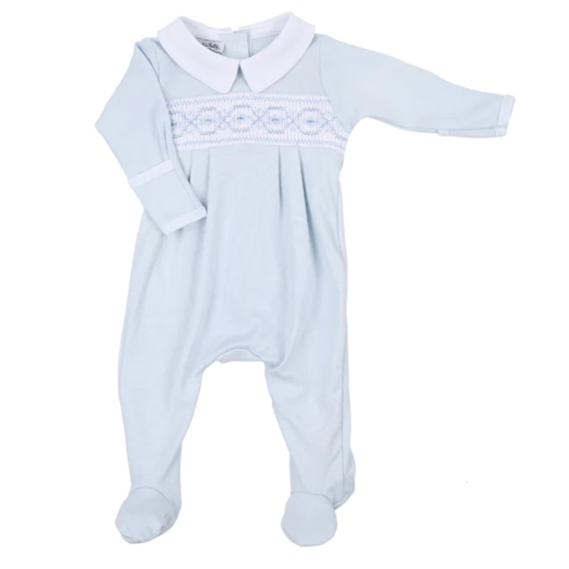Abby and Alex Smocked Collared Footie - BlueAbby & Alex Collectionis a timeless treasure trove of exquisite baby clothes crafted from the softestpastelpink Pima cotton and adorned with hand-embroidered roses and delicate hand-smocking.This collection embod