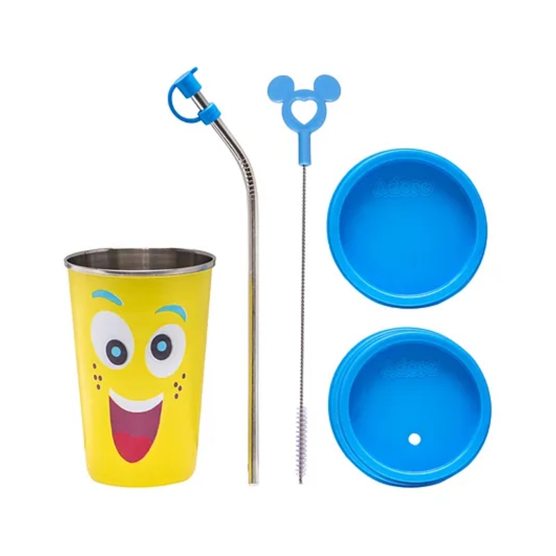Stainless Steel 304 (18\8) Grade Food Grade Spill Proof, Dishwasher Safe Ergonomic Design Ultra-Durable & Light Weight Best-in-class storage capacity Spill Proof – Silicone Lid for Hygiene BPA Free, Freezer Safe, SterilisableSpecificationsBrand – AdoreType – Tumbler With Straw and LidAge – 12 Months+Material – Stainless SteelCapacity – 350 mlProduct Dimensions – L 8 x B 8 x H 11.5 cmProduct DescriptionAdore Blissful SS Tumblers and Straws are manufactured from 304 (18\8) Food Grade Stainless Steel, adding to it is the ergonomic design which perfectly complements the tumbler by firmly enhancing the grip and the airtight lid which are spill proof by making it easy to carry on the go and having a mess-free experience This set has an extra closed lid which helps to carry any liquids when the straw is not in use. The straw cleaning brush makes it an easy way to clean the straws without hassle. These tumblers are manufactured using world-class, state-of-the-art machinery. Ergonomic Design – Ergonomically designed to make this a mess-free experience. Easy Maintenance This Bottle is Dishwasher safe. For a better experience use Adore Bottle and Nipple Liquid Cleanser with Adore Bottle Cleaning Brush kit for an easy and relaxed experience of cleaning the bottle and accessories. Recommend using Adore Bottle drying rack to drain water and save time in drying.Items included in the package1N Tumbler, 1N Straw, 1N Hole Lid, 1N Closed Lid, 1N Straw Cleaning Brush