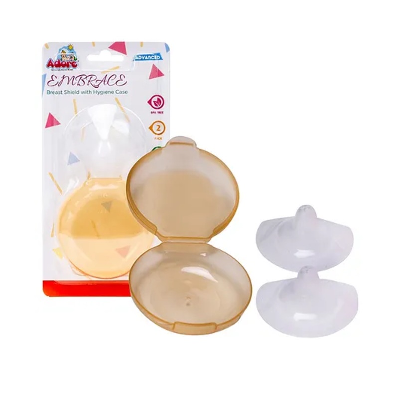 BPA Free Food Grade Silicon Designed for Easy Latch Processed from Super Soft & Premium Silicon Protects Sore or Cracked Nipples Ensures Soft Latch during Breast Feed Ergonomic Design Sterilizable Helps draw the nipple out when it is flat or inverted Useful while feeding “teething toddlers”SpecificationsType Nipple Shield With CaseBrand AdoreMaterial SiliconePackage dimension L 21 x B 10.5 x H 4.5 cmAge Range 0 MonthsInstructions for feeding Wet the inside of the shield with a few drops of water to form a seal. During breast feeding the nipple shield should be held in place with the finger lying flat under the breast and the thumb lying above the nipple. To help the baby get used to the shield, express some milk into the shield.Cleaning and sterilizing Before and after each use, wash the shield with warm, soapy water and then rinse and dry. Adore Liquid Cleanser is best recommended. Do not clean or allow coming in contact with solvents or harsh chemicals. This could result in damage. Suitable for sterilization.Product DescriptionAdore Embrace Premium Breast Shields are processed using state-of-the-art machinery. These premium shields are processed from 100% Super Soft and feather-touch silicon that can be sterilized. These shields protect sore or cracked nipples and minimize pain during breastfeeding, helping draw the nipple out when it is flat or inverted. This set comes with a safety hygiene case.Pack of 2 Nipple Shields with Case.