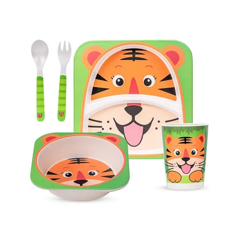 BPA Free Ergonomic Design Premium Bamboo Fibre Bamboo Cutlery Dishwasher Safe Sterilizable Set Contains- Partition Plate, Cutlery, Bowl and Glass Safety for your baby Made from natural bamboo fiber, non-toxic, eco-friendly. It is much safer than plastic and other harmful materials. Let your kids fall in love with eating A cartoon-pattern tableware set for kids creates excitement that keeps children at the table longer and makes eating a meal more fun. Lightweight & perfect for kid’s hand Lighter than ceramic, it is best for you and your toddler to carry them more easily. And the texture of the bamboo makes it comfortable for kids to hold. Great for home, picnic, party, travel, restaurant, outdoor and more Durable & Sturdy Adore Bamboo fiber tableware is sturdy and durable, non-slip and drop-proof. The design allows children to eat and dinner with confidence, ease not afraid of the tableware from turning overSpecificationsBrand – AdoreType – Tableware SetAge – 6 Months to 10 YearsMaterial – Bamboo FibrePacking Dimension- L 20 x B 15 x H 10 cmPlate Dimension – L 27.9 x B 19.5 cmBowl Dimension- L 16.5 x B 12.7cmSpoon & Fork Dimension- L 13.9 x B 1.27 cmCup Dimension- 7.6 cmProduct DescriptionThis dinner set comes with a divided plate, a large bowl, a fork, a spoon, and a tumbler. It is composed of premium, entirely non-toxic bamboo fibers. Fun tableware can often be all that’s needed to make a meal more interesting for kids. With its deep walls on the plates and bowl, comfortable, easy-to-hold handles, grippy bottoms, and a rainbow of vibrant colors, this charming dining set from the Deepashri Collection is ideal for toddlers. These dinner sets are the ideal complement to any toddler-friendly table setting because they are dishwasher safe and BPA-free. This set elevates self-feeding to a new level because toddlers like eating like adultsItems included in the package1 Partition Plate, 1 Spoon, 1 Fork, 1 Bowl, 1 Glass