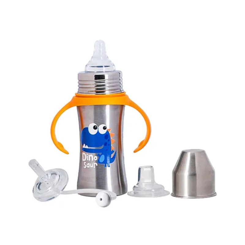 304(18\8) Stainless Steel Food Grade Material BPA Free Ergonomic Design Anti-Colic Teat Straw with Gravity Ball Spill Proof Multipurpose- Feeding Bottle,Spout sipper and Straw Sipper Durable body that is shatterproof and Easy to Maintain Easy to Carry, Easy to Handle, and Easy to CleanSpecificationsBrand – AdoreType – Feeding Bottle,Spout and Straw Steel SipperAge – 0 to 24 MonthsDimensions – L 5 x B 5 x H 17 cmCapacity – 250 mlBottle Material – Stainless SteelTeat Material – 100% Food grade SiliconeDishwasher Safe – YesBPA\BPS free – YesProduct DescriptionAdore! Trion 3 Stage Premium Stainless Steel Printed Feeding bottles are manufactured from 304 (18\8) SS Food Grade Material with a Food Grade Silicone Teat, Spout, and Straw. Multi Usage The Flexi Soft Silicone teat acts as Feeding Bottle. In the Next stage, replace the teat with Flexi soft silicone spout to use as a Spout Sipper Cup. In the Next stage, replace the Spout with Flexi soft Silicone straw to use as a Straw Sipper Cup. Moms’ Feel – The Flexi Soft Teat, Spout, and Straw are manufactured from super soft and flexible Food grade silicone and the same shape as mom’s nursing nipple for a familiar fit. A Matte surface enables the baby to get a secure and continuous latch.Items Included in the Package1N Steel Bottle Bottle, 1N Anti-Colic Teat, 1N Silicon Spout, 1N Silicon Weighted Straw, 1N Steel Hood, 1N Handle.Material Food Grade 304 SS