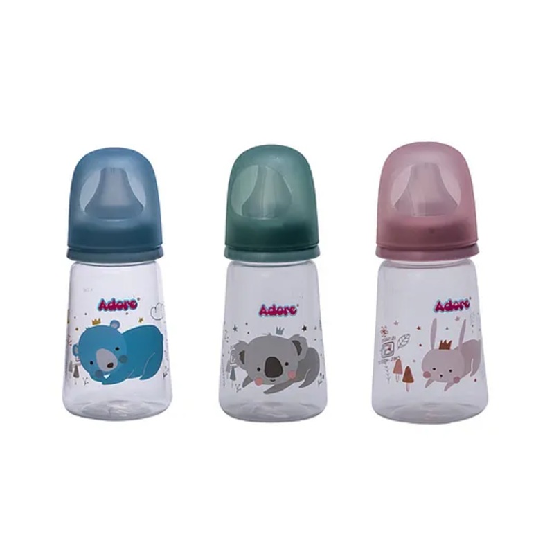 BIS ApprovedFood Grade MaterilaNarrow Neck Bottle with Teat & HoodBPA freeErgonomic designMicrowave Safe, Freezer SafeSterilizer FriendlyPremium Matte Finished Anti Colic TeatLeak Proof bottleSet of 3 Attractive shadesSpecificationsBrand - AdoreType - Feed