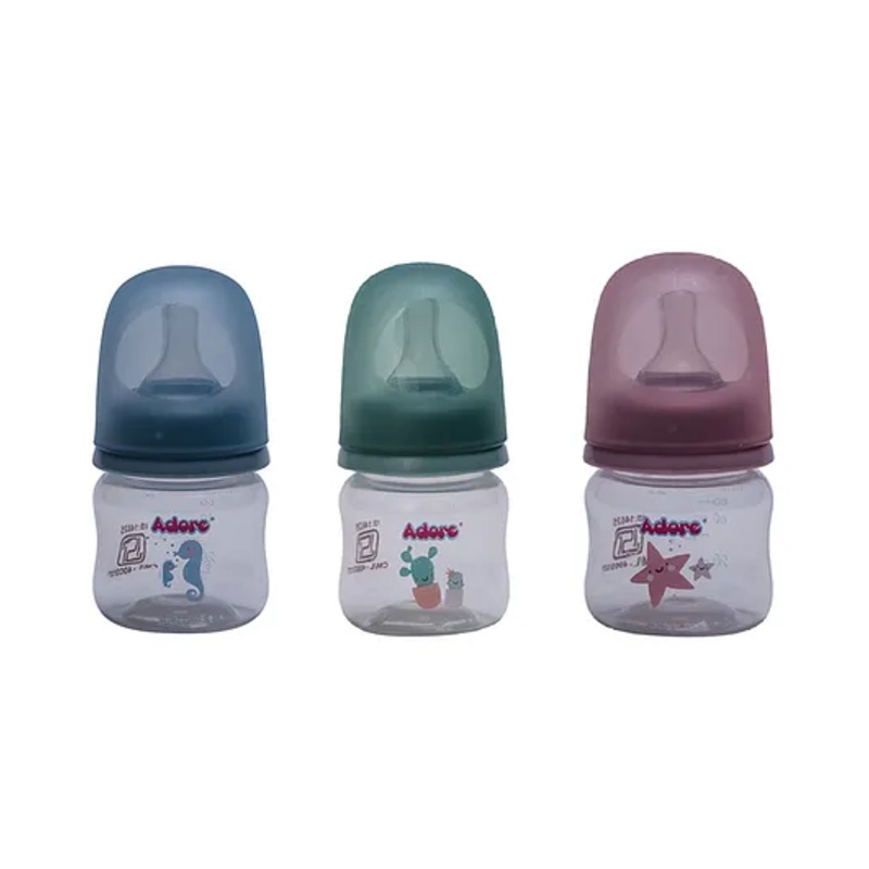 BIS ApprovedFood Grade MaterilaNarrow Neck Bottle with Teat & HoodBPA freeErgonomic designMicrowave Safe, Freezer SafeSterilizer FriendlyPremium Matte Finished Anti Colic TeatLeak Proof bottleSet of 3 Attractive shadesSpecificationsBrand - AdoreType - Feed