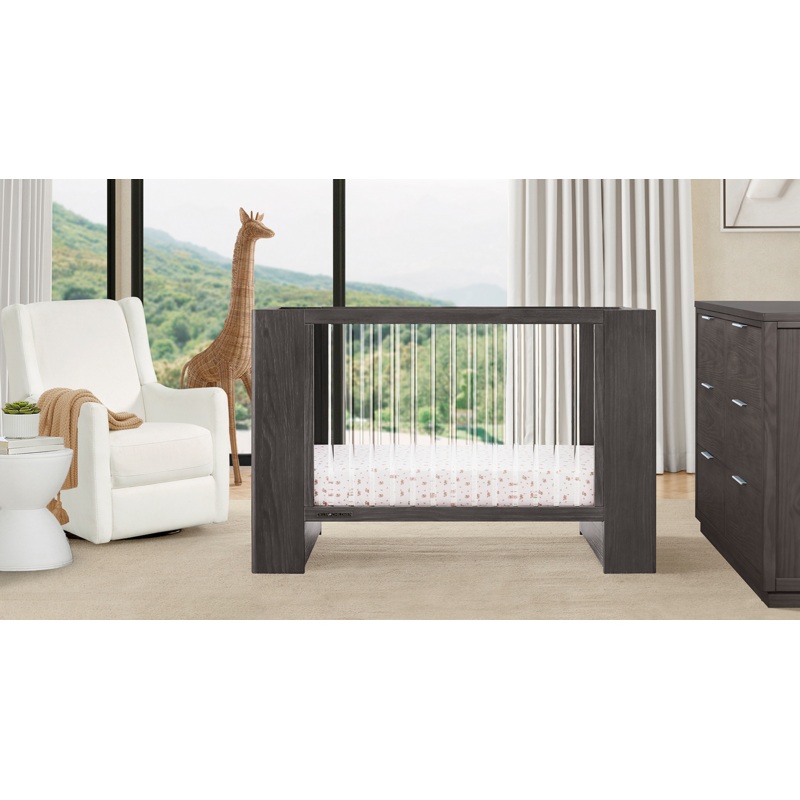 The Aerin Nursery Set by Delta Children is the clear choice for your babys modern nursery! Its unique design features a crib, toddler guardrail, dresser, glider, mattress, mattress pad, and sheets.
