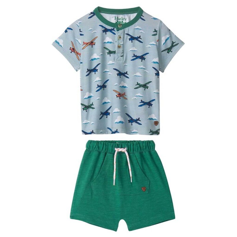 Airplane Green Set is ready for takeoff! Made from soft and breathable bamboo fabric, this Henley features an adorable airplane print and a classic button-down neckline. Perfect for playdates or family outings, it combines style and comfort effortlessly. T