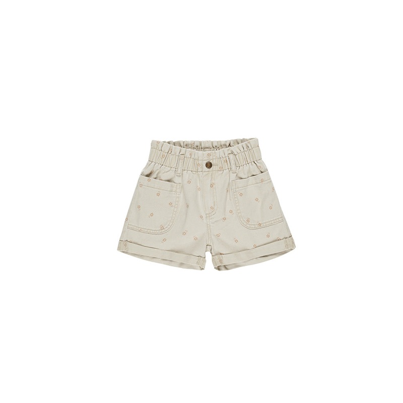 Lightweight denim shorts with a gathered elastic waistband, front patch pockets, a fixed cuff hem, belt loops, and cute button snap.Featuring our ditsy print on our sand hue. Simple flowers make a statement on this summer style.Care: Machine wash cold. Tum