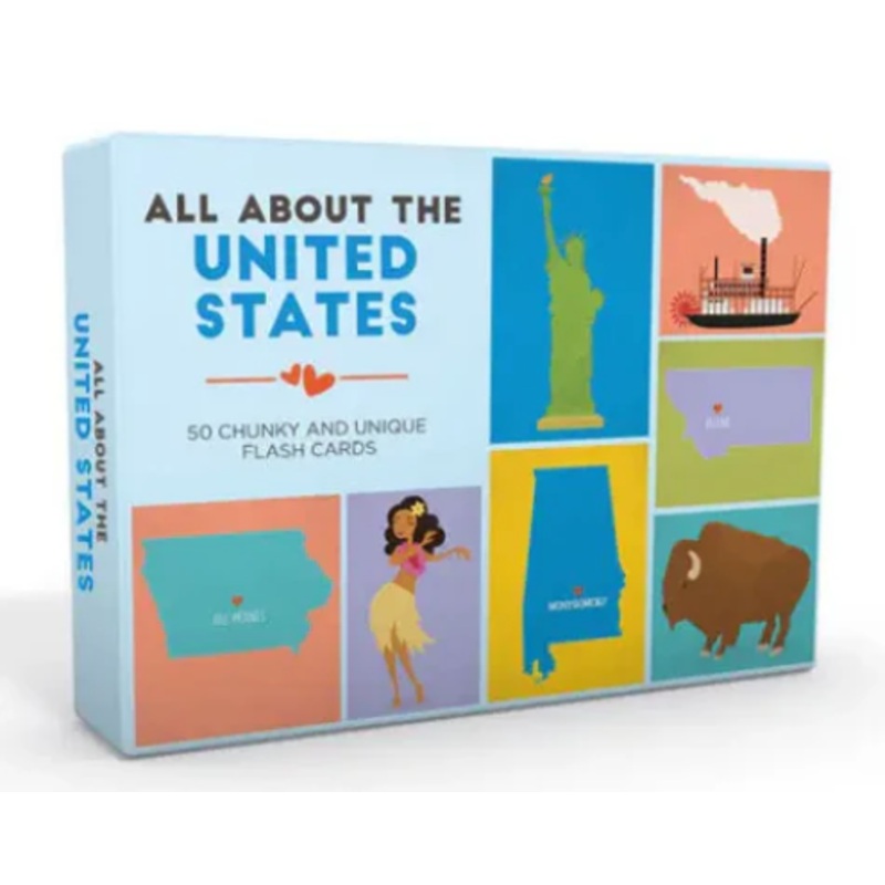 - 50 two-sided chunky and unique cards that cover all the states in the US.