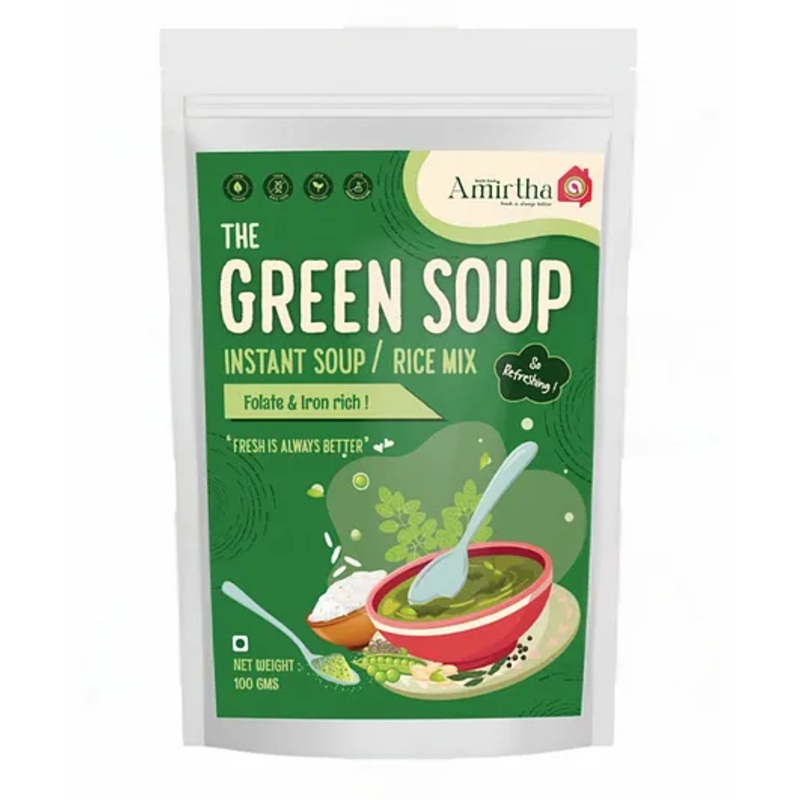 Recommended for kids 1 year & above, suitable for all age groupsRich in iron, folate, calcium & fiber – supports energy, digestion & immunityPacked with natural antioxidants & essential nutrients from greens and seeds (including pumpkin seeds)Light, comforting & easy to digest – a nourishing meal for all agesVersatile use enjoy as soup, rasam, rice mix, or a healthy add-on to roti\dosa100% preservative-free fresh food with no refined sugar, salt, maida, milk solids, artificial flavors, or colorsSpecificationsBrand Amirtha Health FoodsType The Green SoupAge Group 1 year & above (suitable for all age groups)Ingredients Green Peas, Moringa Leaves, Curry Leaves, Garlic, Spices, Pumpkin SeedsPreparation Time Ready in 3 minutesNet Weight 100gPack Size 1 UnitProduct DescriptionAmirtha’s Green Soup is a wholesome, nutrient-rich meal crafted for kids above 1 year and loved by all age groups. Made with the natural goodness of moringa leaves, curry leaves, garlic, pepper, green peas, and pumpkin seeds, this blend is rich in iron, calcium, folate, and antioxidants that support energy, immunity, digestion, and overall wellness. Its light and comforting texture makes it easy to digest, while its versatility allows it to be enjoyed as a soup, rasam, rice mix, or a nourishing side with rotis and dosas. With no refined ingredients or preservatives, this quick 3-minute recipe is a clean, safe, and nourishing addition to your family’s meals.Items Included1 x 100g Pack of Green Soup Mix
