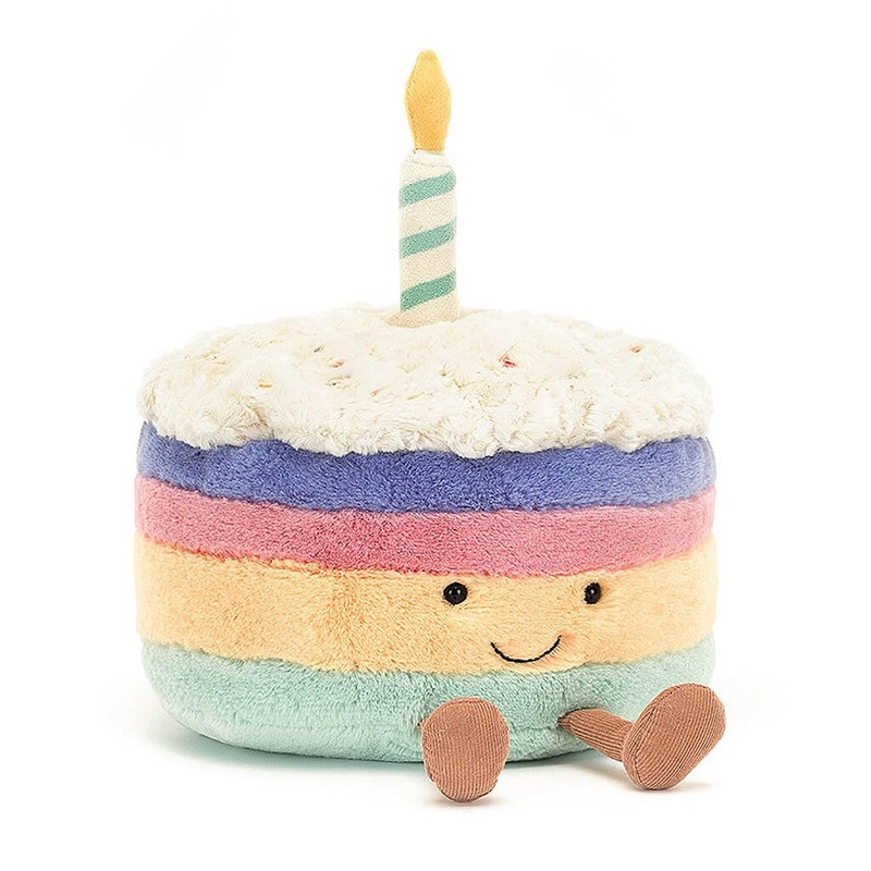 Celebrate in color withAmuseable Rainbow Birthday Cake! This joyful cake has four soft layers in pink, purple, yellow and green, fluffy icing with chocolate flecks and a suedette stripe candle with a golden fur flame. Kick up those cord boots and dance!Amu