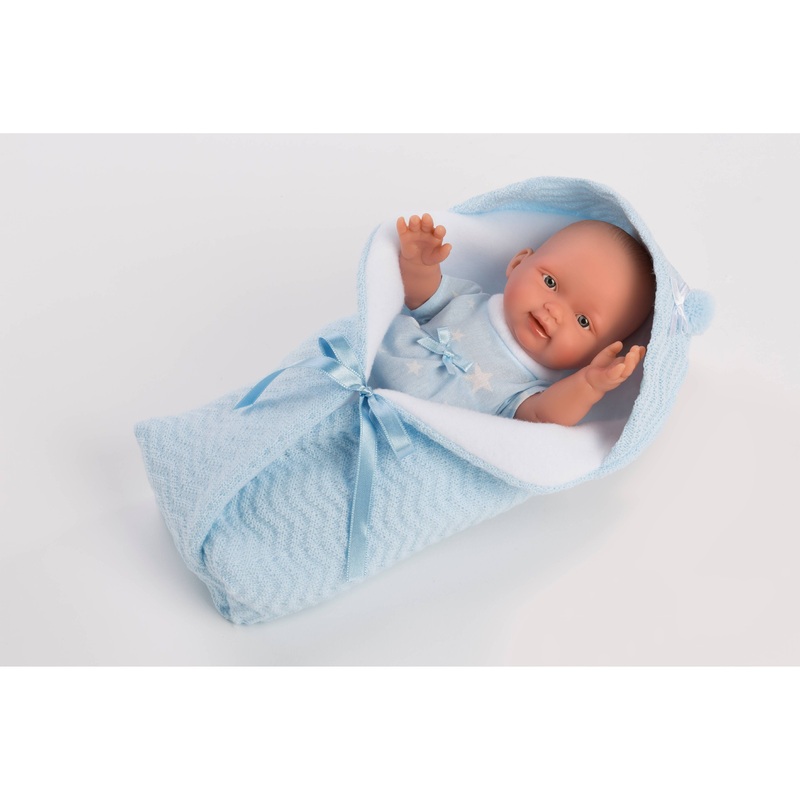 Braydon is the perfect first baby doll. His small size is perfect for toddlers to hold and cherish. He is dressed in an adorable blue onesie with white stars and comes with a knit hooded swaddle blanket to keep him warm.
