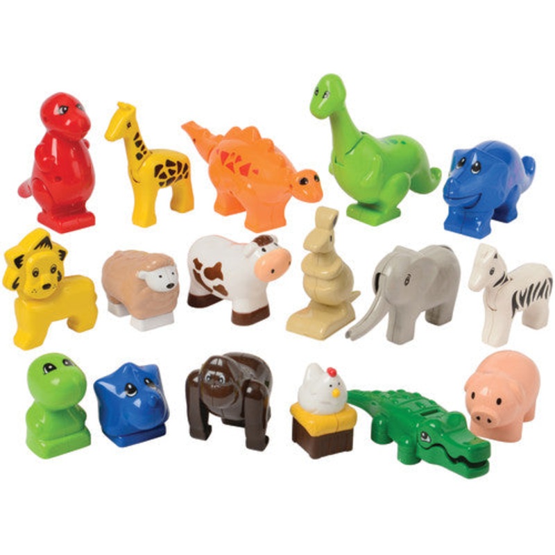 Durable plastic animal set includes 6 dinosaurs, 7 wild animals, and 4 farm animals. Largest dinosaur is 6 H. x 5 L. Animals interlock with most preschool sized bricks. Ages 2 yrs.+