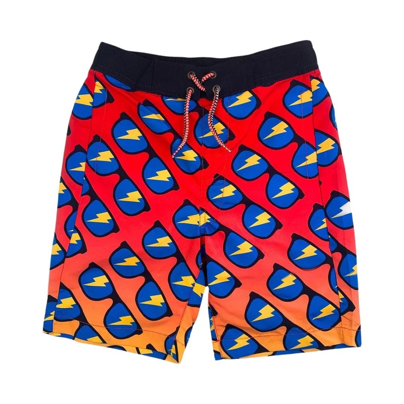 These longer-length swim trunks showcase sunglass printed pattern featuring a mesh lining, side-pockets, and elastic drawstring waistband.