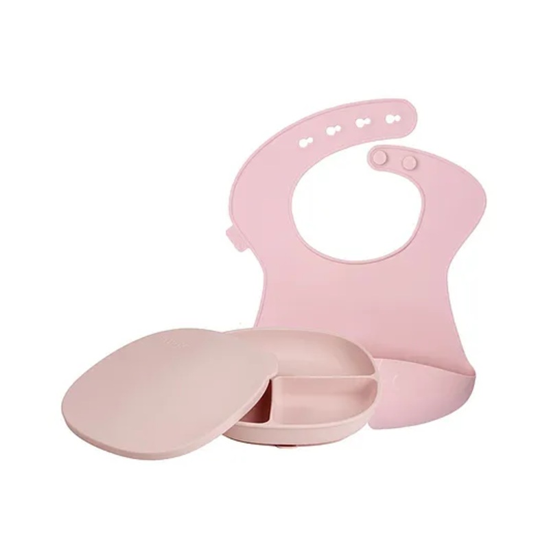 b.box Baby Mealtime Set – Silicone Bib + Suction Plate with Lid | Leak-Proof, Easy to Clean & Store | Pink | BPA-Free Silicone
