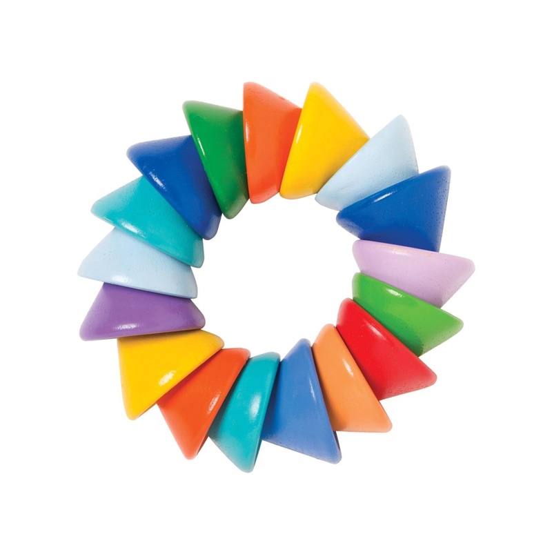 The Bright Baby Cones are a curiousity toy baby will love chewing and investigating. With wooden teething cones strung together by an elastic cord, baby's developing motor skills will be put to the test as they manipulate the cones around the cord. The tee