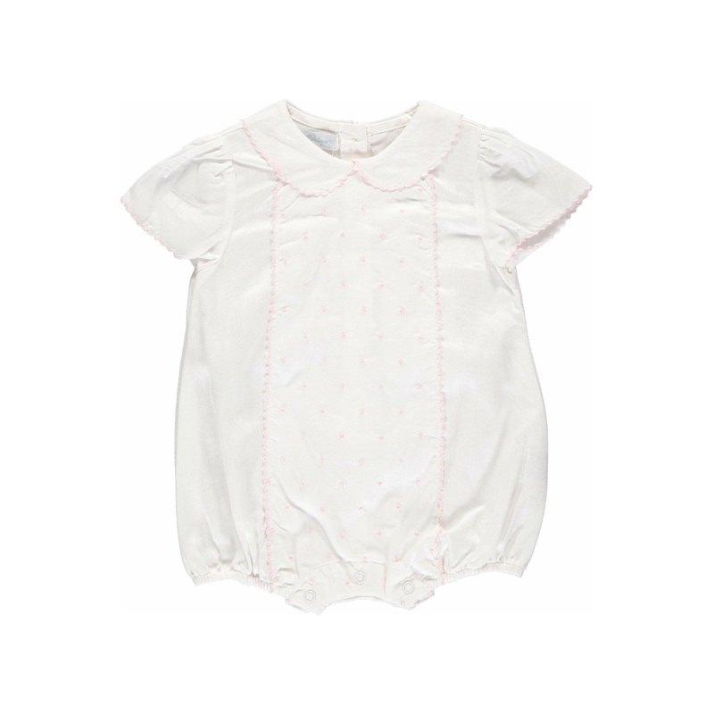 This baby girl’s white bubble has elegant hand embroidered dots in pink.