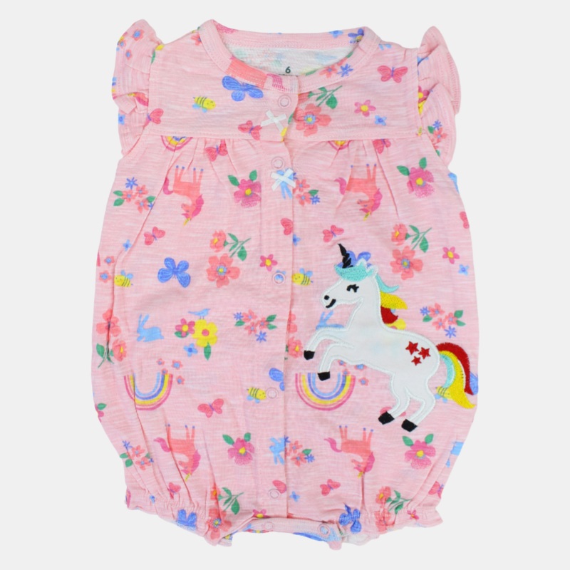 Baby Girls Cotton Romper Pink with Unicorn and Flowers Print