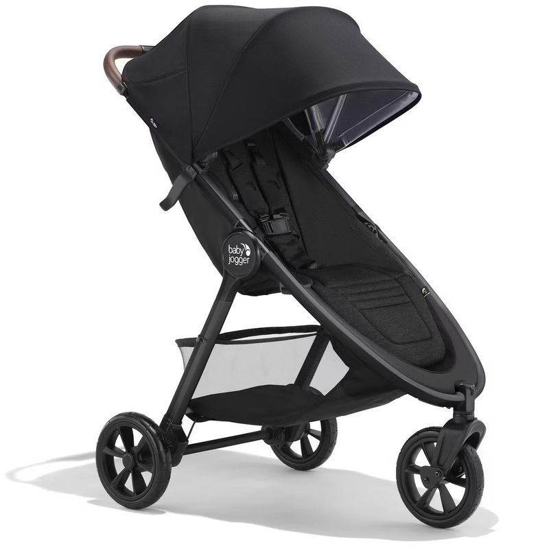 Durability tested. Premium design. One-hand fold. The Baby Jogger city mini GT3 stroller is built to adventure off the beaten path. Made to conquer city streets and forest trails, the forever air rubber tires and all-wheel suspension let you push the boundaries on your adventures. The signature one-hand, in-seat fold keeps you on the go and enables you and your mini to Adventure Together. The self-standing fold allows for easy storage and helps keep the stroller clean in public places because you wont have to lay it down. Experience a premium push with a height-adjustable leatherette handlebar, magnetic buckle, and a spacious storage basket. As your kid grows taller, adjust the harness straps by simply pulling up and positioning them at the next level. Let your little one get comfortable with adjustable calf support and a near-flat reclining seat with the pull of a tab. When your rider wants to sit up, simply push the back of the stroller seat to the upright positionno unnecessary straps or steps. The functional canopy offers three ventilation panels with magnetic closures, so you dont have to wake up your rider when checking on them. The included infant car seat adapters are compatible with all Baby Jogger and Graco infant car seats to make your own travel system. Because it is part of the Baby Jogger eco collection, this stroller features soft fabrics made with recycled materials.