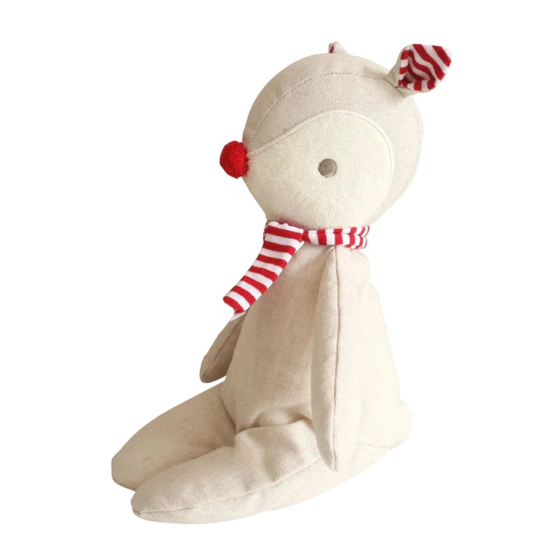A sweet & cuddly floppy reindeer toy with a gorgeous red nose to guide Santa directly to your home for Christmas. Suitable from 18 mths.Features: Soft and cuddly linen and cotton fabricSweet embroidered faceRemovable scarf Suitable from 18 months