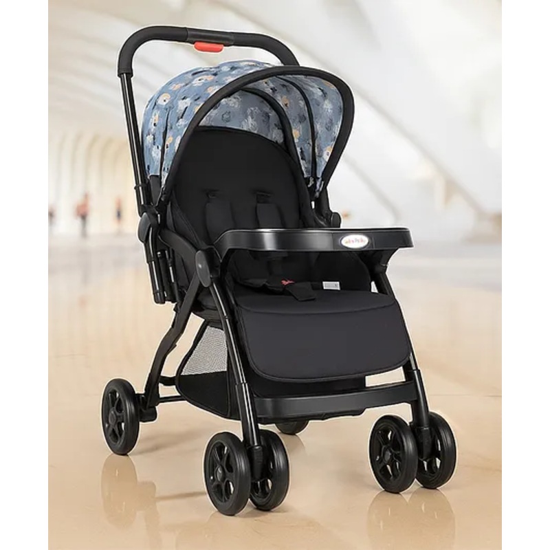 Baby Stroller with 5-Point Safety Harness Animal Print – Grey| Padded Cushioned Seat| Multi-Level Backrest Recline| Single Hand Fold| Linked Brake| Food Tray with Cup Holder| Reversible Handle
