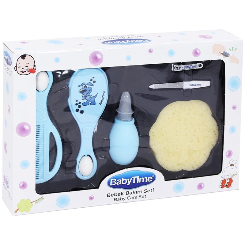 Brand: Baby Time.Product: Baby Care Set 6 In 1.Colors: Blue and Pink.Contents: Hair Brush, Comb, Nasal Aspirator, Bathing Sponge, Nail Clipper, and Nail File.Easy to clean.It can be stored easily.