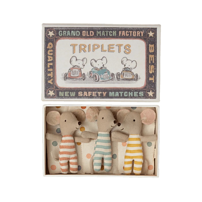 Surprise! It's triplets!Not two, but three baby mice in a box!They cozy up together in their box to sleep and keep their mummy on her toes during the day. Dressed cute & complementary in stripes, they come cuddled together in blanketed pockets.Mice measure