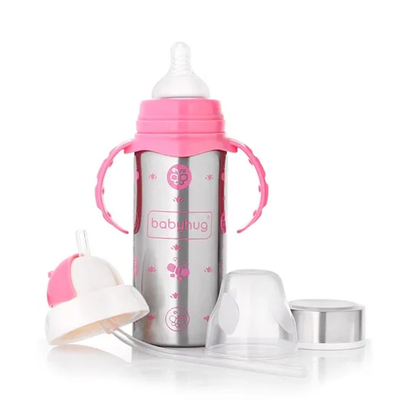 Babyhug 3-in-1 Stainless Steel Bottle with Twin Handles Pink – 180 ml