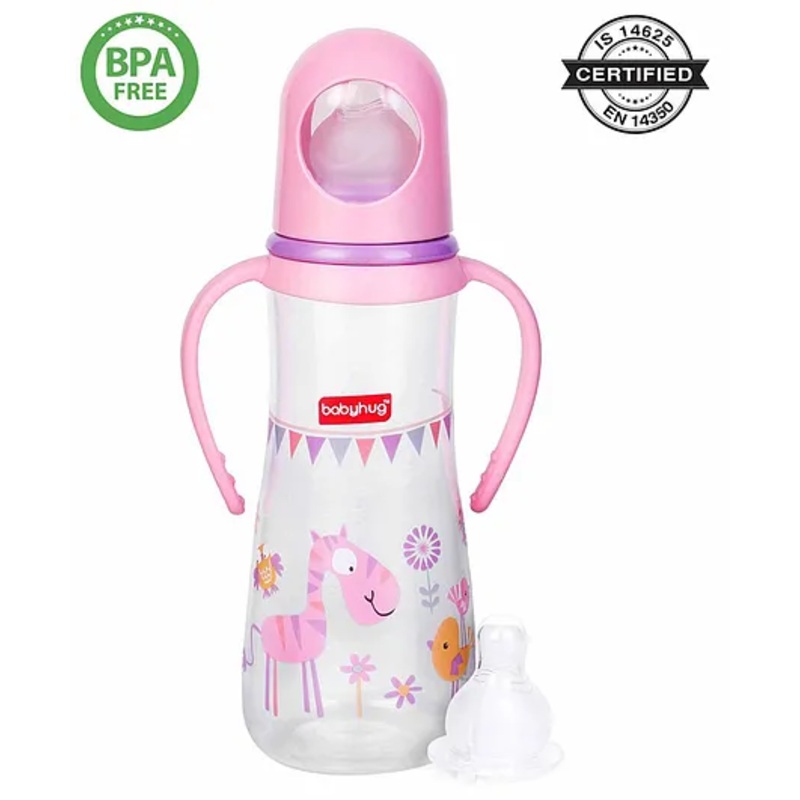 - Specifications Brand -Babyhug Type -Feeding Bottle Capacity – 250 mlFlow Type – Slow Flow Age – 0 Months + Height – 19 cmDimensions Height 19.5 cm, Width 6.2 cm Diameter – 5.5 cm Material –BPA-free Polypropylene (PP) and SiliconeNipple Flow Slow Flow Product DescriptionIntroducing the Babyhug Bubble Anti-Colic Sterilizable Feeding Bottle With Handles, designed to provide a comfortable and enjoyable feeding experience for both baby and parents. This advanced feeding bottle features an anti-colic valve in the nipple that vents air, reducing gas and fussiness. Crafted from BPA-free, food-grade silicone, the nipple is gentle on your baby’s delicate mouth. The bottle’s ergonomic design, complete with twin handles, ensures it is easy for little hands to hold. Items included in the Package OneFeeding Bottle