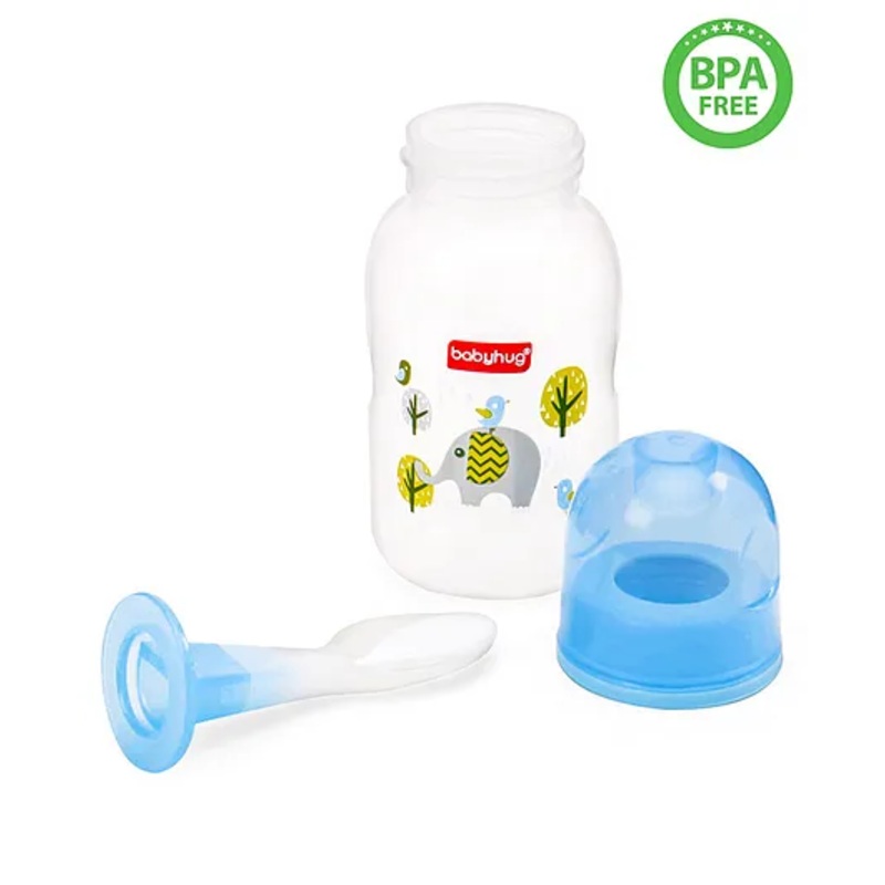 - Adorable Elephant Print Adorned with a cute elephant print that will captivate your child’s interest and make drinking fun.Step-by-StepHow to UsePrepare the Feeder Wash your hands thoroughly before preparing the feed. Wash the feeder with warm, soapy water and rinse well.Fill the Feeder Pour the desired amount of baby cereal or puree into the feeder bottle.Attach the Spoon Securely attach the spoon to the feeder bottle. Ensure it’s tightly fitted to avoid spills.Feed Your Baby Gently squeeze the bottle to allow the cereal to flow through the small hole in the spoon tip. Feed your baby with small amounts to prevent choking.After Feeding Remove any remaining food from the feeder and disassemble the parts.How to CleanDisassemble the Parts Separate the spoon, bottle, and particle cleaner.Rinse Immediately Rinse all parts immediately after use to prevent food from drying and sticking.Wash Thoroughly Use warm, soapy water to wash all parts. Use the included particle cleaner to remove any stuck food particles from the feeding tract.Sterilize For an extra layer of cleanliness, place all parts in boiling water for 5 minutes or use a sterilizer.Dry Completely Allow all parts to air dry completely before reassembling or storing.Usage ScenariosHome Feeding Perfect for daily use at home, making mealtime fun and easy for both parents and babies.Travel Compact and convenient for on-the-go feeding. Just pack the feeder with cereal and you’re ready to feed your baby anywhere.Daycare Ideal for sending with your child to daycare, ensuring they have a familiar and easy-to-use feeding tool.Outdoor Adventures Whether it’s a picnic or a day out at the park, the Babyhug Cereal Feeder With Spoon makes feeding your baby a breeze.Specifications Brand – Babyhug Type – Cereal Feeder Box Dimension- 5.5 x 5.5 x 17 cm Product Height – 13.5 cm Circumference – 17.5 cm Diameter – 5 cm Capacity – 150 mlMaterial -Bottle, Cap & Hood – Polypropylene,Nipple – SiliconeProduct DescriptionIntroducing the Babyhug Cereal Feeder With Spoon Blue – 150 ml, the ultimate solution for easy and mess-free feeding! This clever design combines the convenience of a bottle with the functionality of a spoon, ensuring your little one enjoys their meals effortlessly. Crafted from 100% food-grade, BPA-free liquid silicone, this feeder is safe, durable, and gentle on your baby’s delicate gums. The ergonomic design makes it easy for both parents and babies to hold, while the special spoon tip ensures just the right amount of cereal flows into your baby’s mouth. Plus, it comes with a sleek particle cleaner to keep the feeding tract clear of any stuck food particles. Items included in the package 1Cereal Feeder
