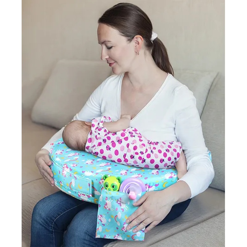 - Cloth Pouch Attached pouch to keep burp cloth, wipes, toys etc.Specifications-Brand – BabyhugType – Feeding PillowAge – 0-24 monthsDimensions – L 54.5 x B 36 x H 16 cmKey Benefits-Enhanced Comfort Provides optimal support for both baby and parent during feeding sessions, ensuring a cozy and comfortable experience.Secure Feeding Position The built-in belt keeps the pillow securely in place, allowing parents to focus on bonding with their little ones without worry.Purpose\Use The charming Unicorn print in Blue adds a touch of style to your nursery, making feeding time visually appealing.Target Age Group Ideal for Nursing Mothers. Suitable for newborns to infants during feeding and sitting support.Ease of UseSimple Setup The pillow is easy to position around the waist, with a straightforward buckle system that allows for quick adjustments.Versatile Usage Can be used for breastfeeding or bottle-feeding, adapting to your feeding style and preferences.Machine Washable The cotton cover is removable and machine washable, making it easy to keep clean and fresh for your baby.Benefits for BabiesComfortable Feeding The supportive design ensures babies are comfortable while feeding, reducing fussiness and promoting longer feeding times.Promotes Bonding A cozy environment fosters a close bond between parent and baby during feeding, enhancing emotional connection.Encourages Good Posture The ergonomic shape helps maintain proper posture for babies, supporting healthy development.Benefits for ParentsReduces Strain Provides support to reduce strain on the arms and back during feeding, making the experience more enjoyable for parents.Convenient Feeding Aid The adjustable belt and secure design allow parents to feed their babies hands-free, giving them the freedom to relax or multitask.Stylish Addition The cute Unicorn print adds a playful touch to feeding time, making it more enjoyable for parents as well.MaintenanceEasy to Clean The pillow features a removable cover that is machine washable for hassle-free cleaning.Durable Materials Crafted from high-quality materials that withstand frequent washing, ensuring longevity and lasting use.Quick Drying The cotton fabric dries quickly, allowing for prompt use after washing, making it a practical choice for busy parents.Product Description-Facing posture issue while breastfeeding your baby? Babyhug introduces you to a perfect solution- Breast-feeding pillow. Baby Feeding Pillow is a carefully designed accessory for nursing mother and newborns. It renders sheer comfort and allows the mother and the baby to cherish special bonds while breast-feeding.Items Included in the PackageOne Baby Feeding PillowCare InstructionMachine and hand wash with cold water.Wrap the feeding pillow around your waist for comfortable feeding.