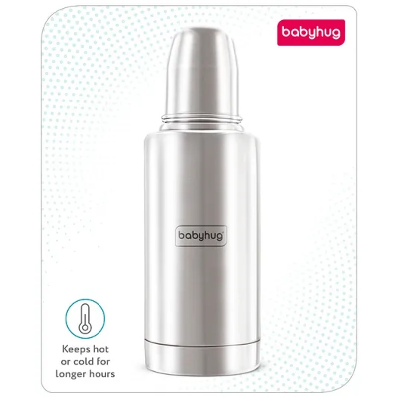 - Leak-Proof The bottle’s leak-proof design ensures that you can carry it in your bag without worrying about spills.Usage InstructionsPrepare the Bottle Ensure all parts, including the nipple and bottle, are clean and sterilized before each use.Fill with Liquid Pour the desired amount of milk or formula into the bottle, making sure not to fill it to the rim.Assemble the Bottle Attach the anti-colic nipple securely to prevent leaks.Feed Your Baby Hold the bottle comfortably and allow your baby to latch onto the nipple.After Feeding Gently remove the bottle and burp your baby to help reduce any gas.Care InstructionsFit the Cap & Check Tightness Ensure the cap is securely fitted before use.Rinse Rinse all parts under warm running water to remove any milk residue.Wash Use a soft bottle brush and liquid cleanser to thoroughly clean the bottle and nipple. Babyhug Multipurpose Liquid Cleanser is recommended for best results.Sterilize Sterilize the bottle and all parts before each use to ensure they’re completely germ-free.Dry Allow all parts to air dry on a clean towel or drying rack before reassembling.Replace Nipple If you notice any bite marks or the nipple becomes loose due to shape distortion, replace it with a new one.SpecificationsBrand BabyhugType Feeding bottleAge 0 Months+Bottle Material 304 Grade Stainless SteelNipple Material SiliconeTeat Cap Material PP (Polypropylene)Flow Type SlowAnti-Colic YesLeak-Proof YesBPA-Free YesFDA Approved YesBottle Neck Type Standard NeckCapacity 300 mlProduct DescriptionIntroducing the Babyhug Insulated Steel Feeding Bottle, a perfect blend of practicality and comfort for your baby’s feeding time. Crafted from high-quality 304 stainless steel, this bottle is designed to be durable, insulated, and safe for everyday use. Its ergonomic design, along with the anti-colic nipple, ensures a comfortable and convenient feeding experience for both parents and babies. Plus, with its leak-proof design and antibacterial properties, you can trust this bottle to keep your little one’s feeding safe and hygienic.Items included in the package1 Feeding bottle1 Leak proof silicon stopper1 anti colic nipple (small & variable )