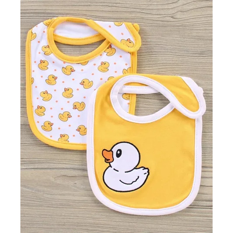 Soft Cotton Material Crafted from soft, breathable cotton, these bibs provide ultimate comfort and gentle touch against your baby’s delicate skin.Velcro Closure Designed with easy-to-use Velcro closures, these bibs offer a secure and adjustable fit around your baby’s neck.Easy to Clean Machine washable for hassle-free cleaning, these bibs can be laundered alongside your baby’s other clothes, maintaining hygiene and freshness after every use.Spill and Stain Protection Featuring a generous coverage area, these bibs effectively shield your baby’s clothing from food spills, drools, and stains, keeping outfits clean and presentable throughout the day.Duck Theme Featuring a charming duck with yellow & white theme, these bibs add a cute and heartfelt touch, making mealtime more enjoyable.Pack of 2 Available in a range of vibrant and eye-catching colors, these bibs not only keep your baby clean but also add a pop of color to their outfit.Ease of UseMachine Washable These bibs are machine washable, making cleanup a breeze. Simply toss them in with your baby’s other clothes for easy maintenance.Easy to Use The Velcro closures make it simple to put on and take off the bibs, ensuring a snug fit every time without any fuss.Benefits for BabiesComfort The soft cotton material ensures maximum comfort, preventing irritation on your baby’s delicate skin during feeding.Development The vibrant colors and adorable prints stimulate your baby’s visual senses, contributing to their sensory development.Benefits for ParentsConvenience With easy-to-use Velcro closures and machine washable fabric, these bibs are a practical choice for busy parents, making mealtime less stressful.Peace of Mind Crafted from safe materials with secure fastenings, parents can trust that their baby is protected and comfortable.MaintenanceCleaning Machine washable for hassle-free cleaning, ensuring the bibs stay fresh and hygienic after every use.Storage Easy to fold and store, these bibs can be conveniently kept in a drawer or diaper bag when not in use, ready for the next mealtime adventure.SpecificationBrand BabyhugType BibsAge Group 0 to 6 MonthsDimensions L 28 x B 19 cmMaterial CottonClosure Type Velcro ClosureProduct DescriptionBabyhug Bib is a must have item for your baby’s accessory kit that comes handy at the time of feeding. This classy looking bib made with premium quality cotton is super soft to suit your baby’s skin. With Snap velcro closure, this bib is easy to put on and remove from your baby’s neck. Go ahead and add this elegant bib to your baby’s wardrobe.Items Included In Package2 Bibs
