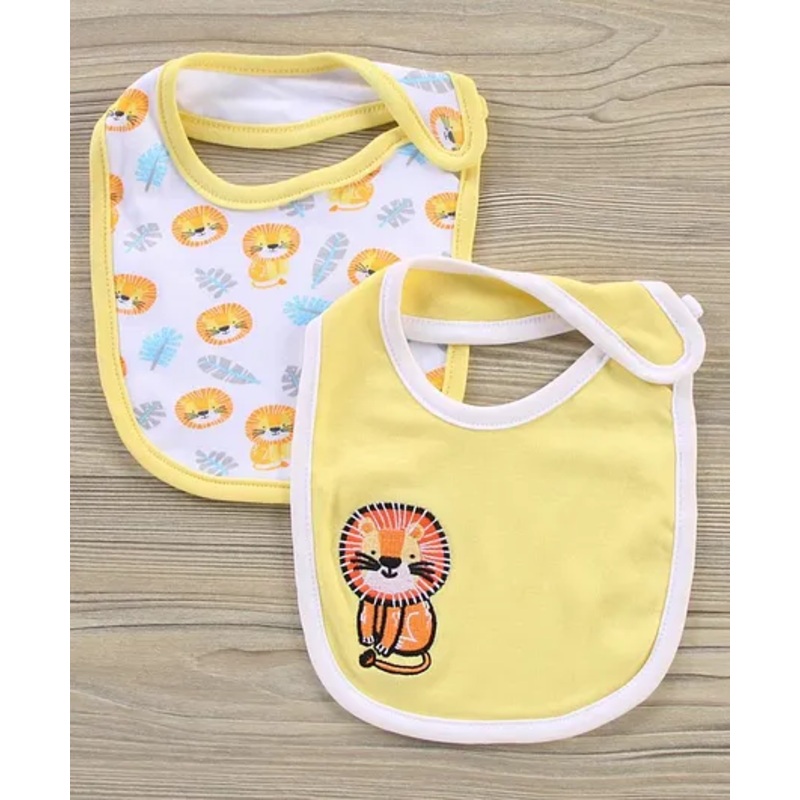 Soft Cotton Material Crafted from soft, breathable cotton, these bibs provide ultimate comfort and gentle touch against your baby’s delicate skin.Velcro Closure Designed with easy-to-use Velcro closures, these bibs offer a secure and adjustable fit around your baby’s neck.Easy to Clean Machine washable for hassle-free cleaning, these bibs can be laundered alongside your baby’s other clothes, maintaining hygiene and freshness after every use.Spill and Stain Protection Featuring a generous coverage area, these bibs effectively shield your baby’s clothing from food spills, drools, and stains, keeping outfits clean and presentable throughout the day.Lion Theme Featuring a charming lion with yellow & white theme, these bibs add a cute and heartfelt touch, making mealtime more enjoyable.Pack of 2 Available in a range of vibrant and eye-catching colors, these bibs not only keep your baby clean but also add a pop of color to their outfit.Ease of UseMachine Washable These bibs are machine washable, making cleanup a breeze. Simply toss them in with your baby’s other clothes for easy maintenance.Easy to Use The Velcro closures make it simple to put on and take off the bibs, ensuring a snug fit every time without any fuss.Benefits for BabiesComfort The soft cotton material ensures maximum comfort, preventing irritation on your baby’s delicate skin during feeding.Development The vibrant colors and adorable prints stimulate your baby’s visual senses, contributing to their sensory development.Benefits for ParentsConvenience With easy-to-use Velcro closures and machine washable fabric, these bibs are a practical choice for busy parents, making mealtime less stressful.Peace of Mind Crafted from safe materials with secure fastenings, parents can trust that their baby is protected and comfortable.MaintenanceCleaning Machine washable for hassle-free cleaning, ensuring the bibs stay fresh and hygienic after every use.Storage Easy to fold and store, these bibs can be conveniently kept in a drawer or diaper bag when not in use, ready for the next mealtime adventure.SpecificationBrand BabyhugType BibsAge Group 0 to 6 MonthsDimensions L 28 x B 19 cmMaterial Interlock CottonClosure Velcro ClosureProduct DescriptionBabyhug Bib is a must have item for your baby’s accessory kit that comes handy at the time of feeding. This classy looking bib made with premium quality cotton is super soft to suit your baby’s skin. With Snap velcro closure, this bib is easy to put on and remove from your baby’s neck. Go ahead and add this elegant bib to your baby’s wardrobe.Items Included In Package2 Bibs