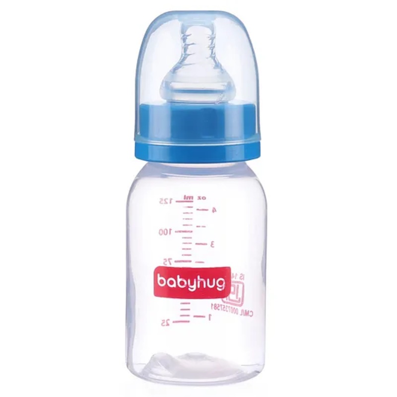 BPA-Free Silicone Nipple Crafted from food-grade silicone, the nipple is safe and gentle for your baby’s delicate mouth.Ergonomic Design Designed for easy handling, this bottle is comfortable for parents to hold and use during feeding time.Microwave and Sterilizer Safe Easily heat and sterilize the bottle, ensuring cleanliness and convenience.Measuring Units Clear measuring units on the bottle for precise feeding, helping you track your baby’s intake effortlessly.Anti-Colic Nipple The special design of the nipple helps reduce colic, ensuring a more comfortable feeding experience for your baby.Leak-Proof Say goodbye to spills and leaks, as this bottle is designed to be completely leak-proof.Usage InstructionsPrepare the Bottle Ensure the bottle, nipple, and all components are clean and sterilized before each use.Fill with Liquid Pour the desired amount of milk or formula into the glass body of the bottle.Assemble the Bottle Secure the silicone nipple onto the bottle, making sure it’s tightly fitted to prevent leaks.Feed Your Baby Hold the bottle at a comfortable angle and let your baby latch onto the nipple. Enjoy this special bonding time!After Feeding Gently remove the bottle from your baby’s mouth and burp them to help reduce any gas.Care InstructionsDisassemble the Bottle Separate the silicone nipple from the glass body.Rinse Rinse all parts under warm running water to remove any milk residue.Wash Use a gentle bottle brush and mild soap to thoroughly clean the inside of the bottle and the nipple.Sterilize Place the bottle parts in a sterilizer or boil them in water for a few minutes to ensure they’re completely germ-free.Dry Allow all parts to air dry on a clean towel or drying rack before reassembling.SpecificationsBrand – BabyhugType – Feeding BottleAge – 0 to 24 MonthsBottle material – PolypropyleneNipple material – SiliconeBPA free – YesLeak proof – YesAnti-colic – YesCapacity – 125 mlDimensions Height 14.5 cm, Width 5 cmNipple Flow Slow flowProduct DescriptionIntroducing the Babyhug Narrow Neck Feeding Bottle, the perfect blend of practicality and comfort for your baby’s feeding time. Made with a BPA-free, food-grade silicone nipple, this bottle is designed to provide a safe and enjoyable feeding experience. Its ergonomic design ensures ease of use for parents, while its anti-colic nipple helps reduce discomfort for your little one. Plus, this bottle is both microwave and sterilizer safe, making it incredibly convenient for everyday use.Items included in the package1 Feeding Bottle, 1 Screw Cap, 1 Hood Cap, 1 Anti Colic Nipple, 1 Sealing Disc