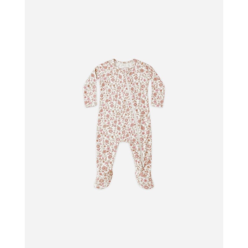 Bamboo Zip Footie - Bloom by Quincy Mae is crafted from soft and stretchy bamboo fabric. Designed for comfort and convenience, it features a full-length zipper, fold-over hand mitts (NB3-6M), and rubber-dotted soles (6-12M+) for grip.Care: Machine wash col